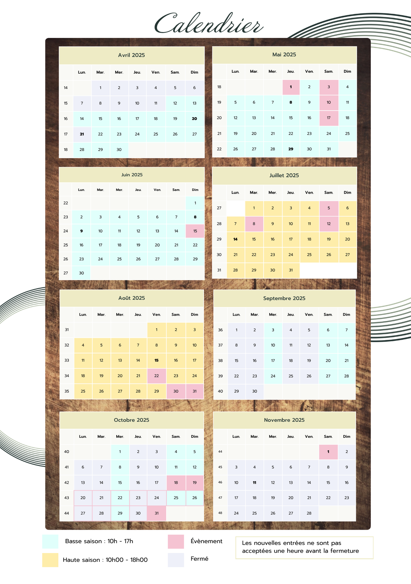 À partir du 7 avril au 31 octobre 2025 et du 04 avril à fin octobre 2026